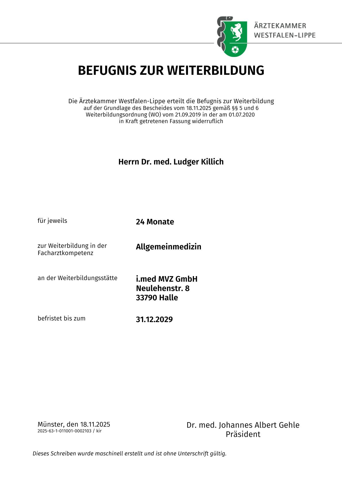 Unsere Praxis verfügt über eine Weiterbildungsbefugnis der zuständigen Ärztekammer für 24 Monate im Fachgebiet Allgemeinmedizin. Ärztinnen und Ärzte in Weiterbildung haben bei uns die Möglichkeit, einen Teil Ihrer fachärztlichen Weiterbildung zu absolvieren.